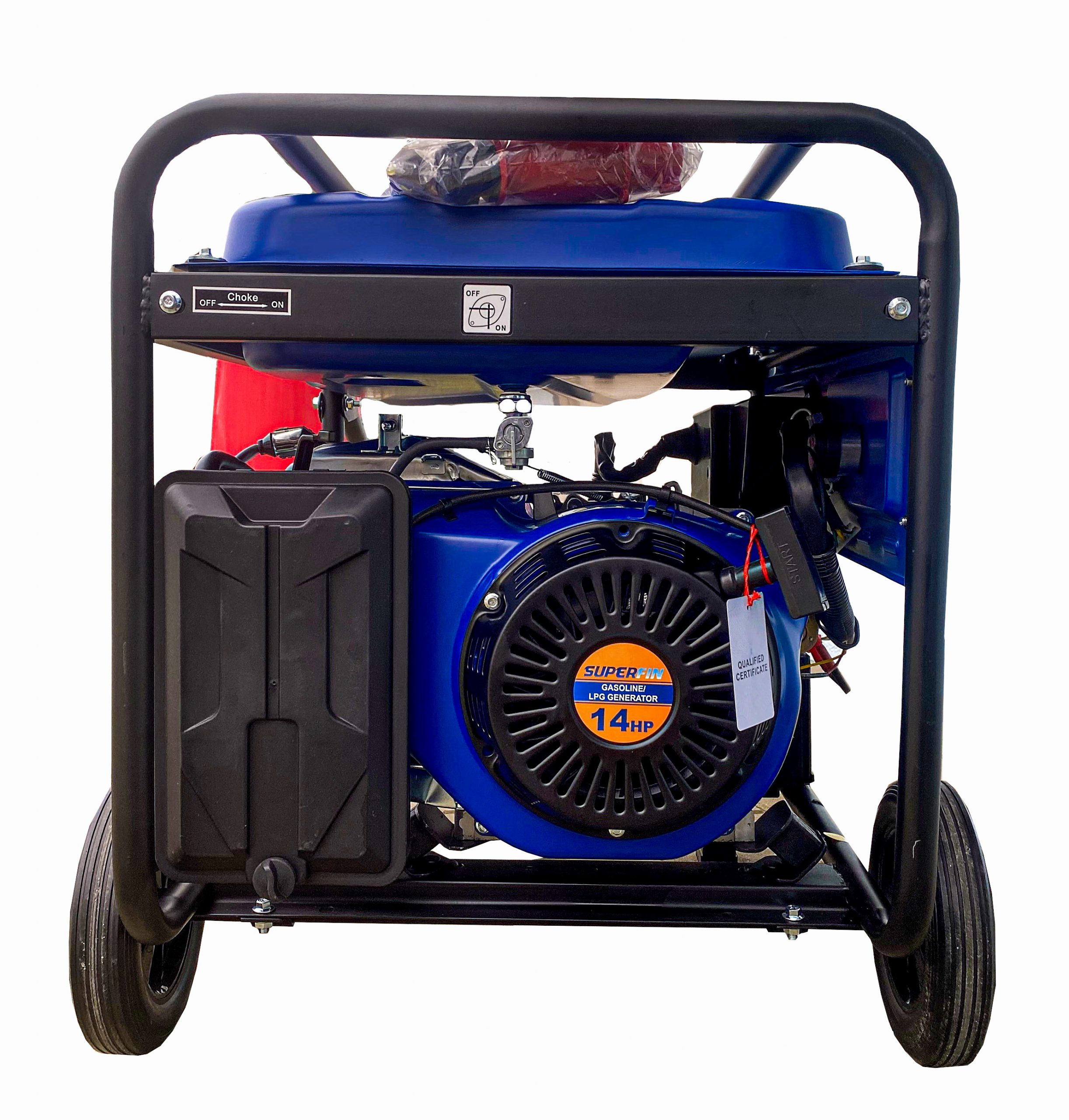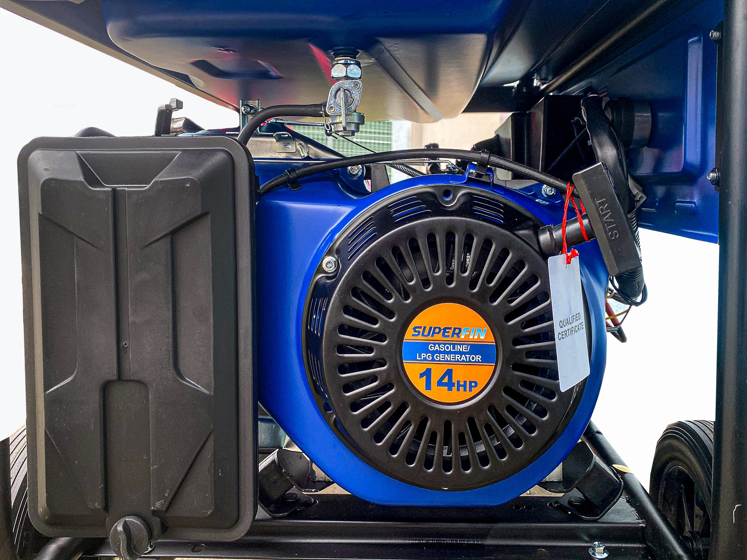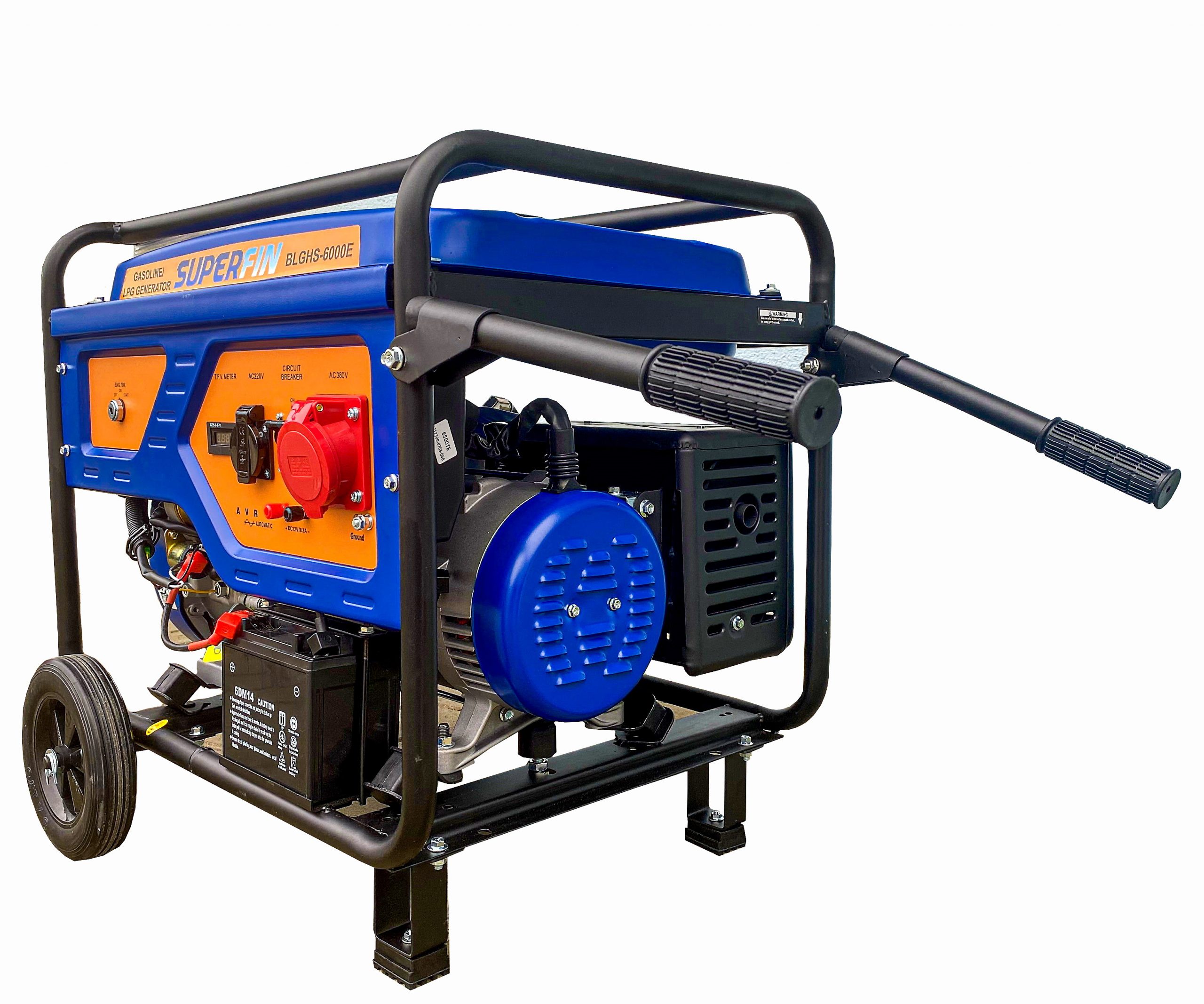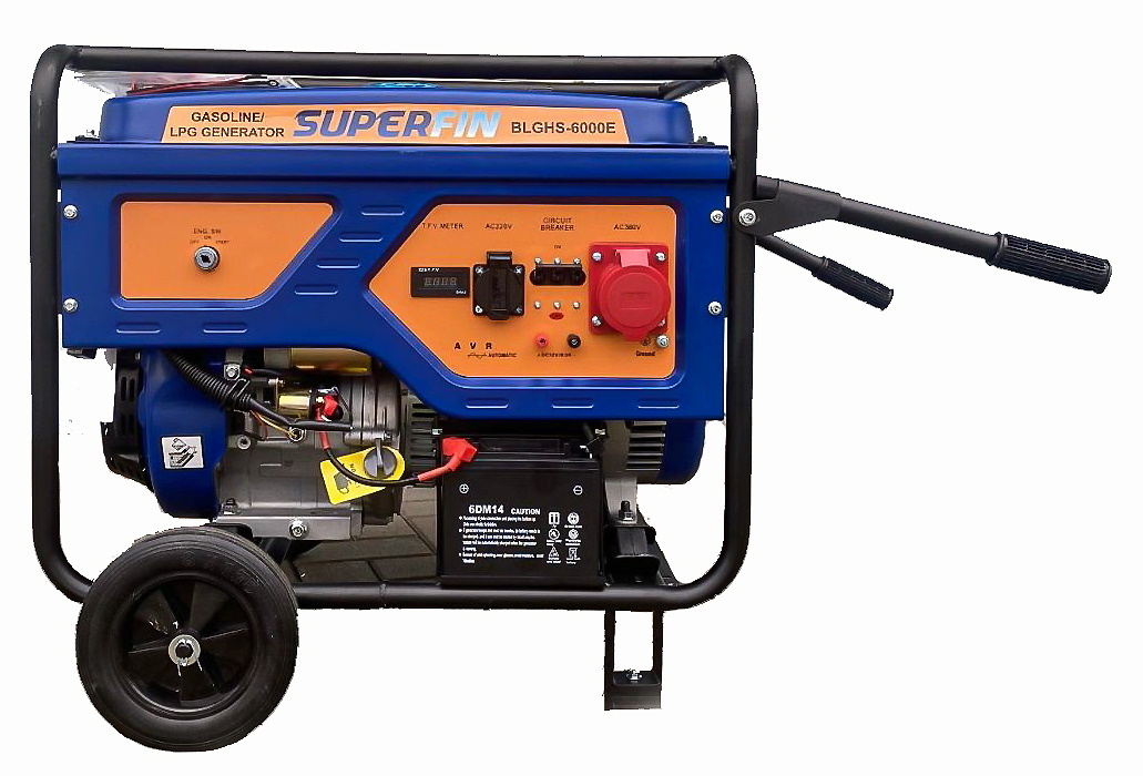Superfin Gas/Benzin Generator, 5500W ist ein leiser und äußerst zuverlässiger Stromerzeuger, 14 PS LPG/Benzin, 4 Takt, Elektrostart, 3Phasen Steckdosen 230V/380V, mobiler Generator, sparsam im Betrieb, automatischer Spannungsregler AVR, stabiles Gehäuse, Tragegriff, Räder, Sofort Lieferbar.