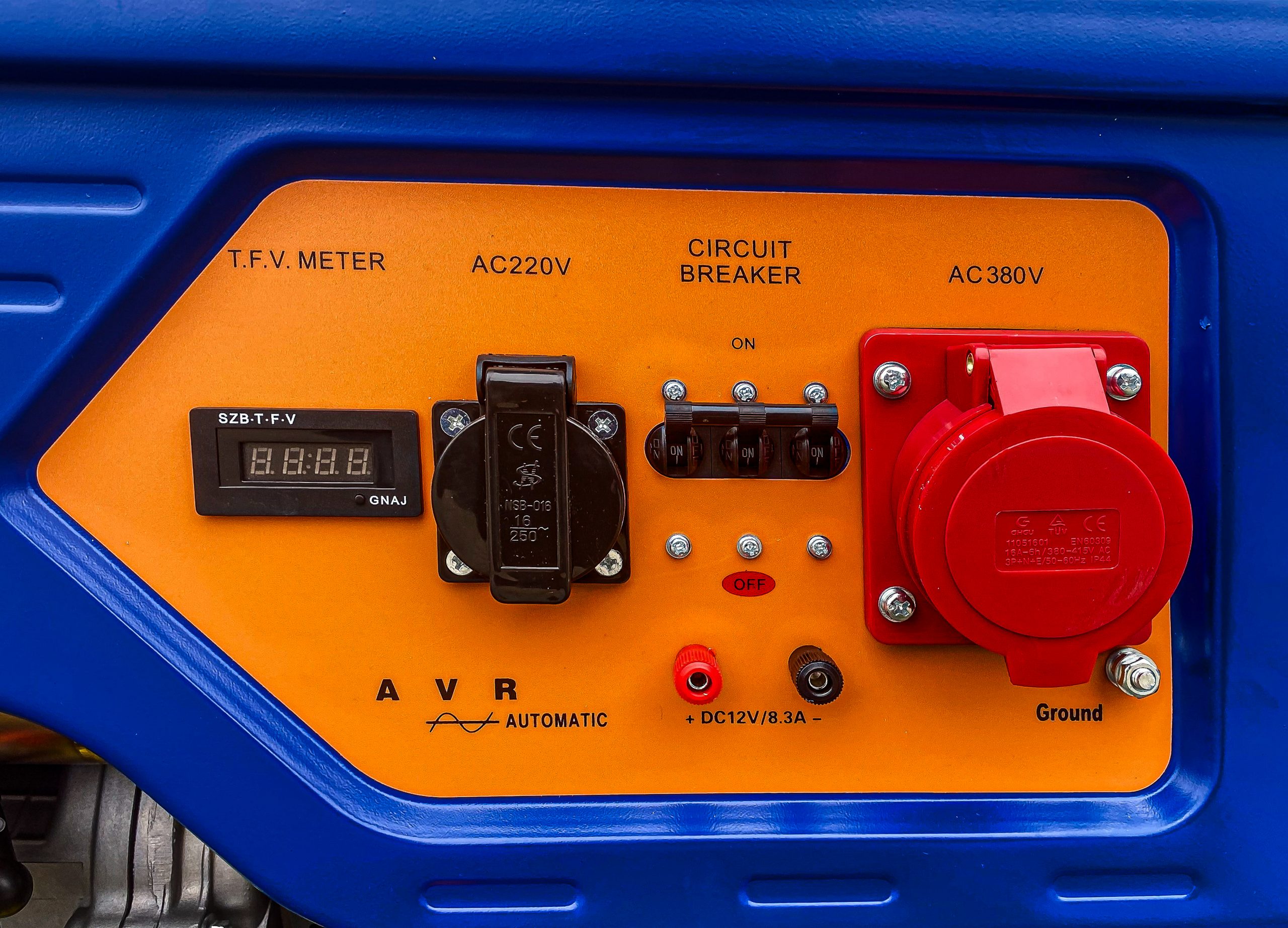 Generatorschalter ermöglicht 230-V- oder 380-V-Betrieb.